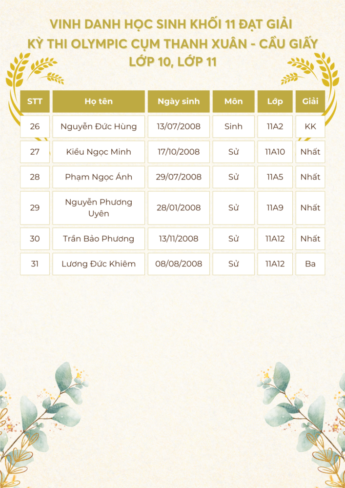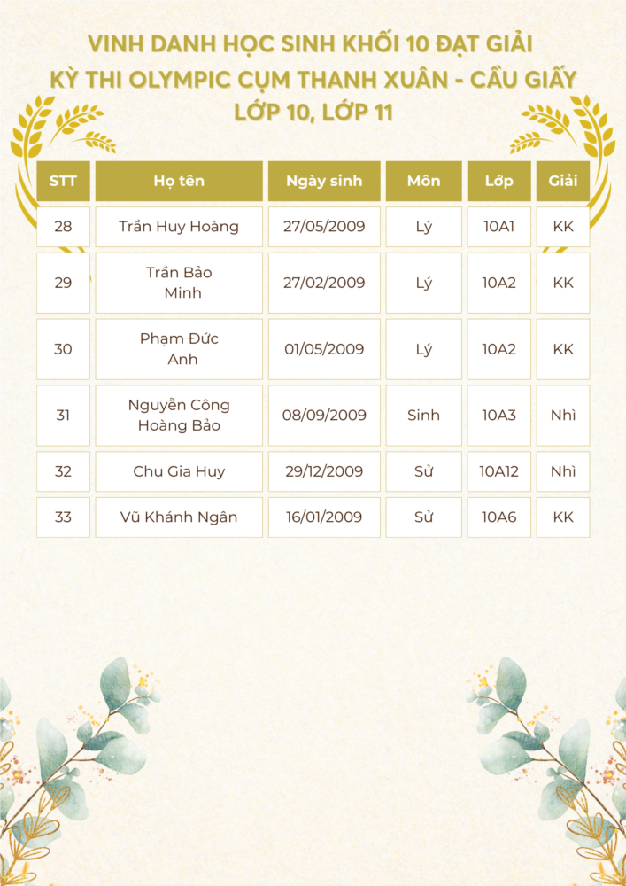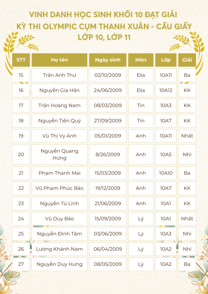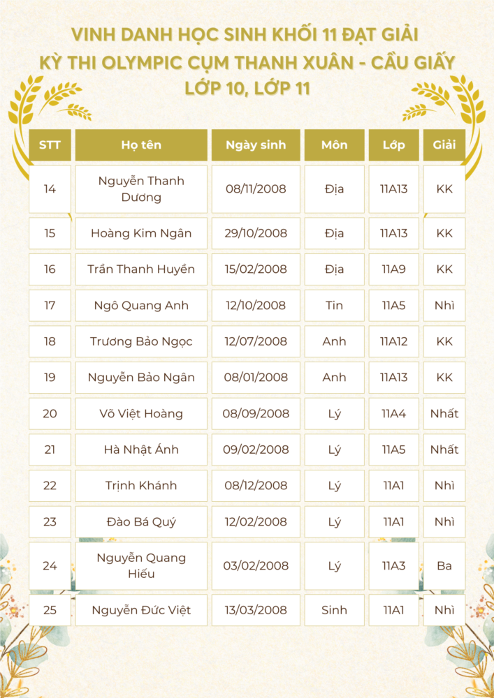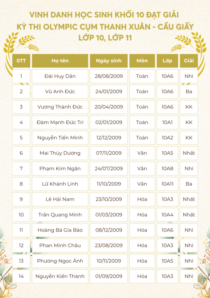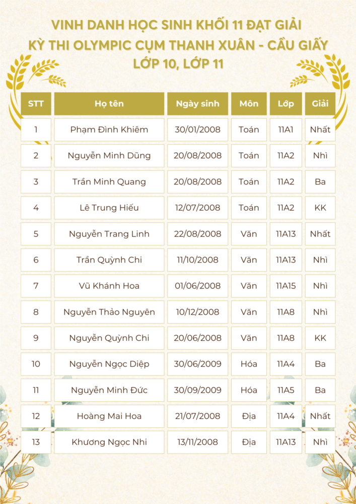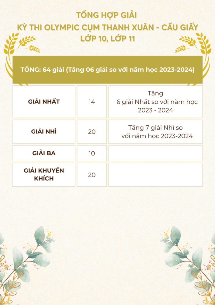 Với quyết tâm lập thành tích cao nhất để góp thêm những danh hiệu cho nhà trường, cũng như thực hiện tốt nhất nhiệm vụ năm học 2024 - 2025, đội tuyển học sinh giỏi của Trường THPT Khương Đình đã tham dự kỳ thi Olympic lớp 10, 11 cấp cụm và đã đạt được những kết quả rất đáng tự hào.