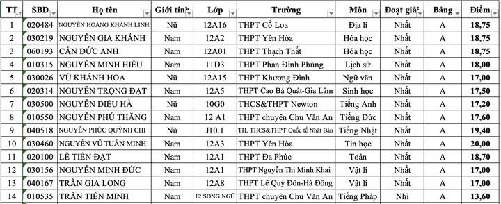 Danh sách 34 thủ khoa thi học sinh giỏi của TP Hà Nội năm học 2025-2026 như sau: