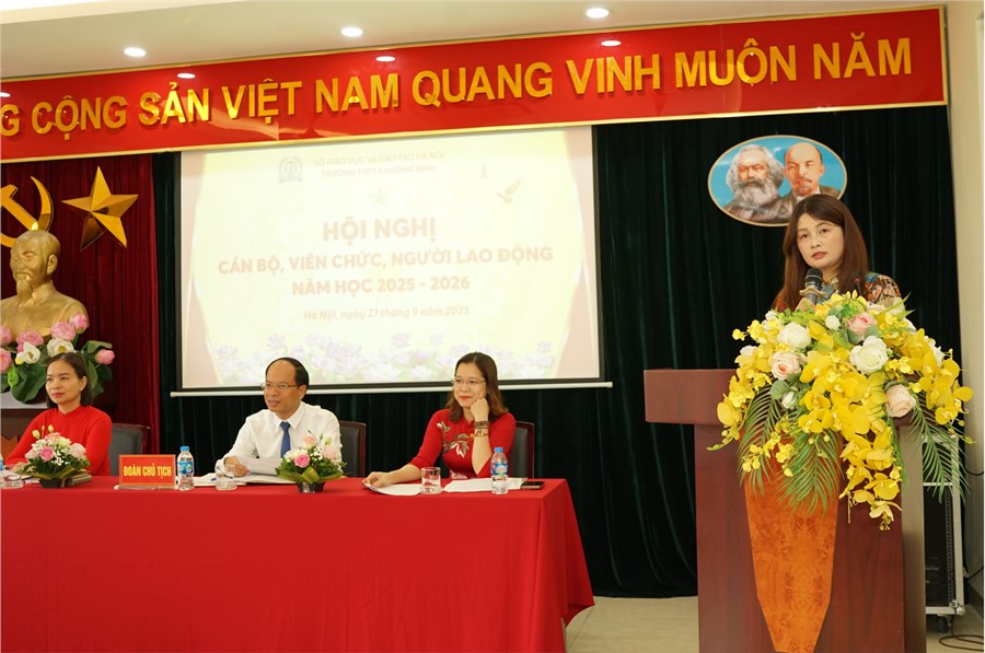 Hội nghị đã đi đến thống nhất về các chỉ tiêu, nhiệm vụ trọng tâm năm học 2025-2026, trong đó khẳng định rõ định hướng phát triển toàn diện của nhà trường: giữ vững kỷ cương nghiêm - nâng cao chất lượng thực - phát huy hiệu quả hoạt động giáo dục. Năm học này, Trường THPT Khương Đình tiếp tục triển khai hiệu quả các phong trào thi đua lớn như: “Xây dựng Trường học Hạnh phúc”, “Nhà giáo tâm huyết, sáng tạo”, hướng tới mục tiêu nâng tầm vị thế, uy tín của nhà trường trong hệ thống giáo dục Thủ đô.